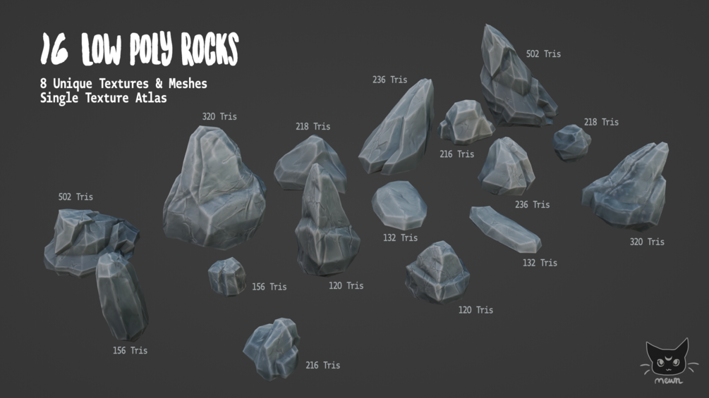 Elevate the terrain of your Roblox games with this selection of intricately sculpted rocks and rock formations. From rugged cliffs to weathered boulders, these assets add dimension and texture to your landscapes. With low poly geometry and a single texture atlas for all rocks, these boulders are optimized for fast performance in-game.